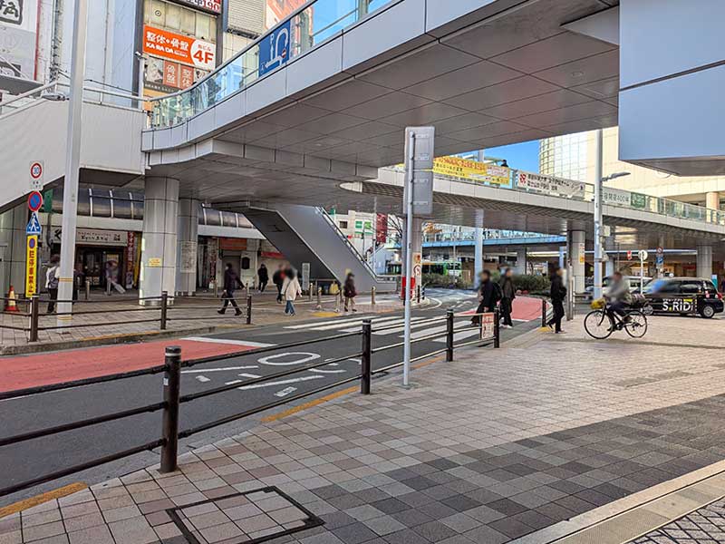 駅のペデストリアンデッキ下に到着したら、左手に横断歩道がありますので、それを渡ってください。