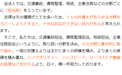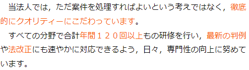 ホームページ上の解決実績等が判断材料になるかと思いますので参考にしていただくとよいかと思いますし、特定の分野に特化した専用サイトを作成しているようでしたら、その分野に力を入れていると判断できるかと思います。