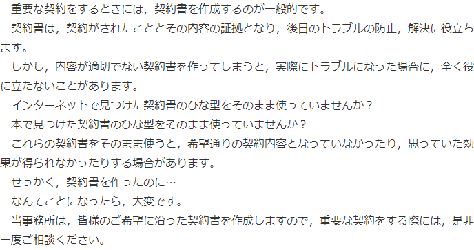 大変申し訳ございませんが、担当弁護士の予定が一杯のため、現在、契約書作成についてのご相談はお受けすることができません。