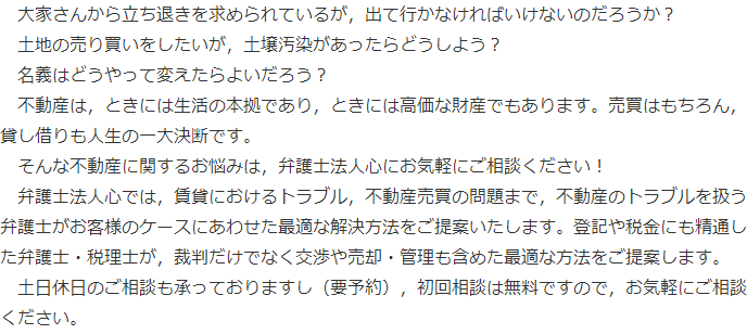 大変申し訳ございませんが、担当弁護士の予定が一杯のため、現在、個人の方の不動産トラブルについてのご相談はお受けすることができません。