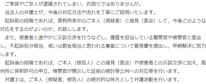 また、不起訴処分、無罪、略式請求、執行猶予付き判決など、刑事弁護により得られる結果ごとに報酬が定められていることが多いです。