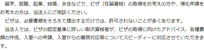 当法人の取次資格者は、それぞれのビザについて、許可の可能性を高めるためのポイントを把握しておりますので、一度ご相談ください。